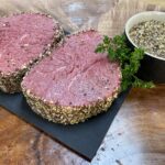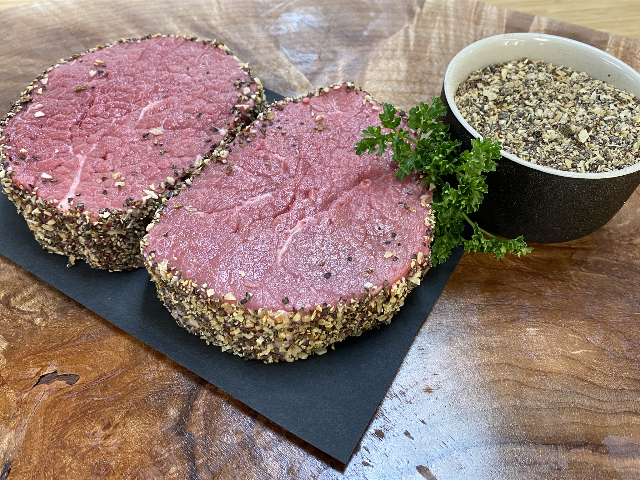 Eye of round steak rolled in crushed peppercorns.