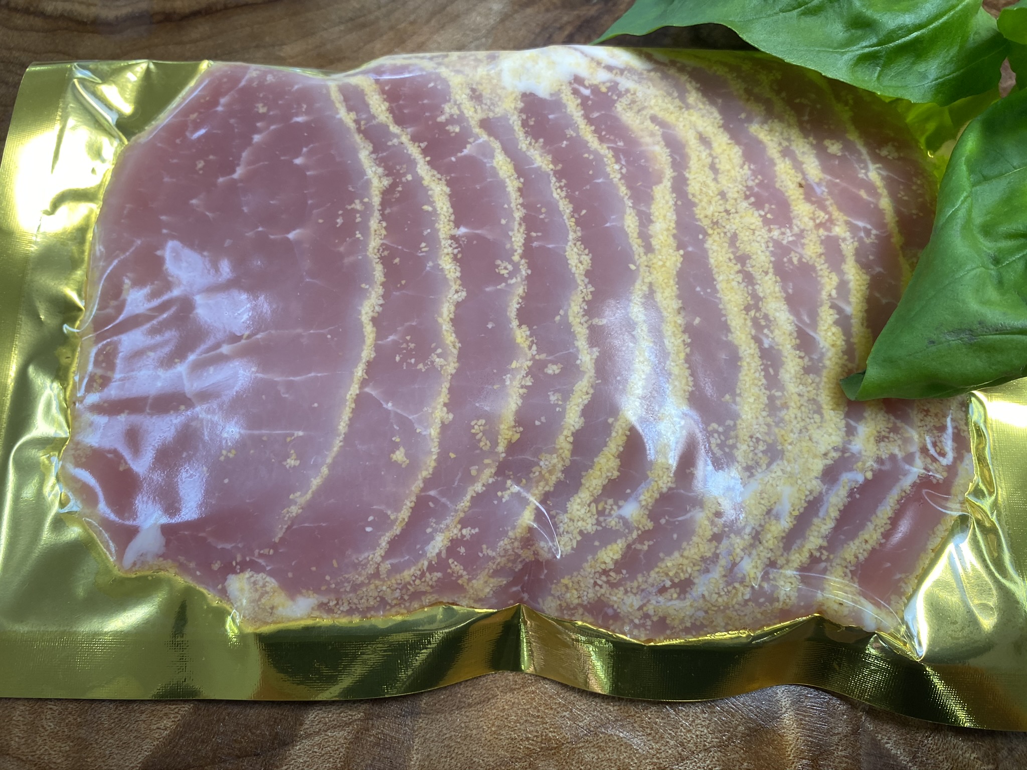 Cured in house, uncooked sliced boneless pork loin rolled in cornmeal.