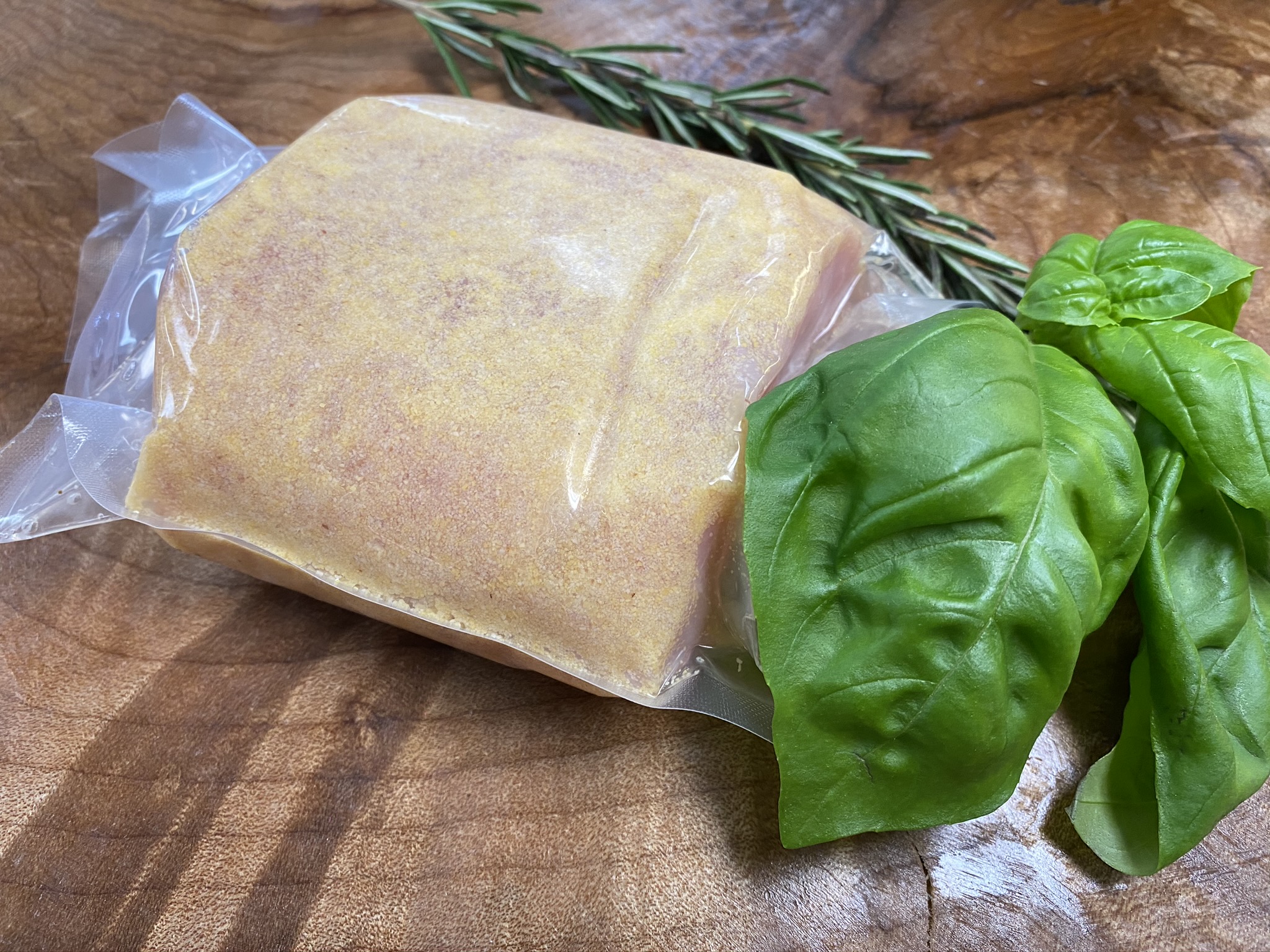 Cured in house, boneless pork loin rolled in cornmeal.