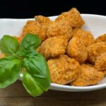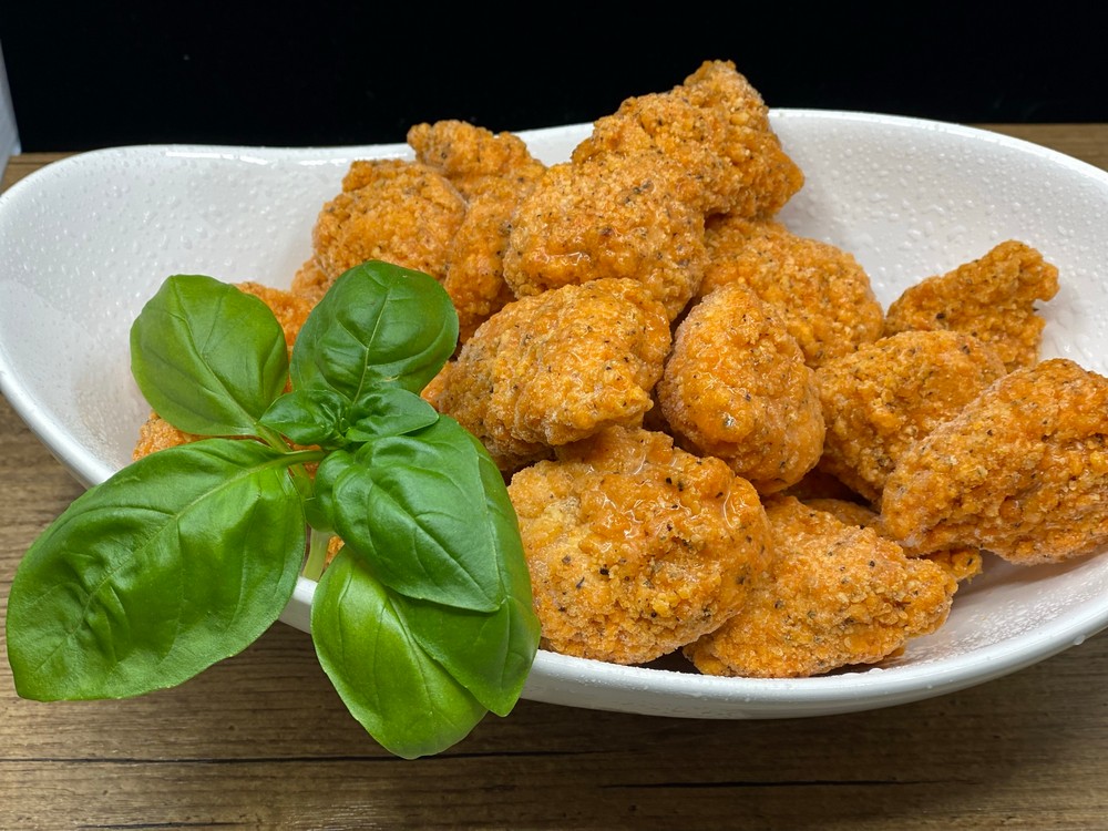 Spic y breaded chicken breast chunks. Frozen, bake at 375F until the internal temperature reaches 165F.