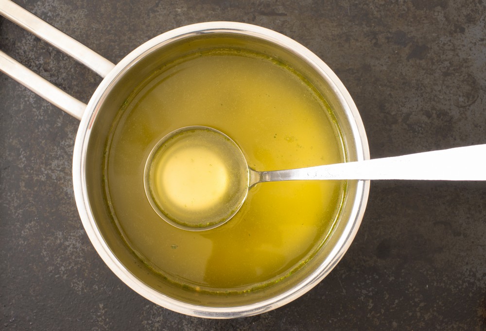 Made in house, roasted chicken bone broth.