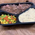 Glenwood’s Roast Beef slices with house made Beef Gravy, Cheesy Garlic Mash Potatoes, peas, carrots and corn. Heat and serve.