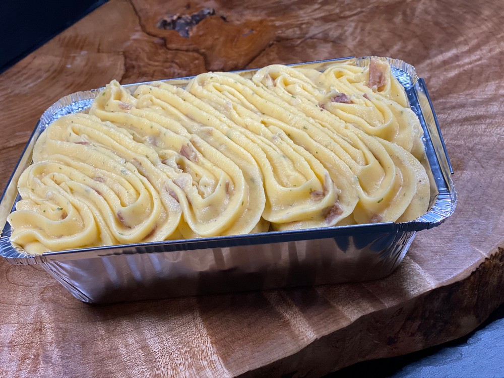 Ground beef and pork mix with vegetables in a rich gravy, topped with cheesy mashed potatoes. Heat and serve.