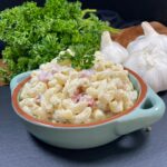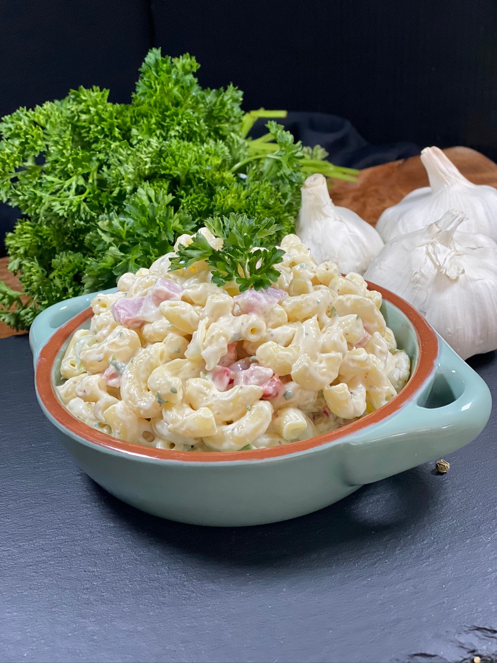 A creamy macaroni and Glenwood Ham deli salad which includes: macaroni noodles, chicken bouillon, onion powder, garlic powder, turmeric, miracle whip, ranch, sour cream, celery, onion, vinegar, mustard, pepper, ham, parsley, red bell pepper.