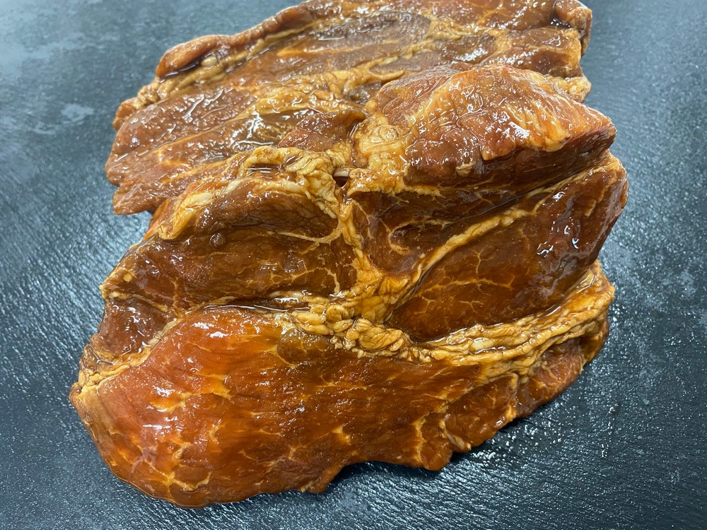 Hawaiian Pork Butt Eye Steaks are richly marbled and tender, marinated in a sweet Hawaiian Sauce.