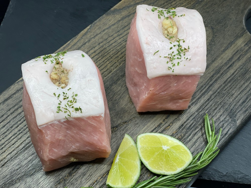 A boneless pork loin chop stuffed with our house made Apple and Brie Stuffing: breadcrumbs, apple slices, apple sauce, cinnamon and brie cheese.