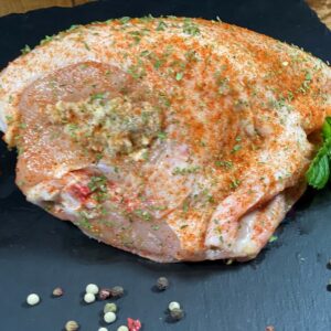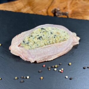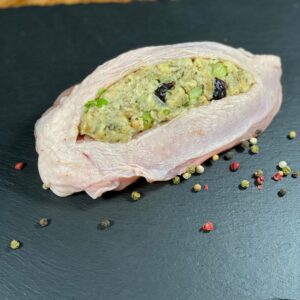 A single skin on chicken breast stuffed with our house made Apricot Curry Stuffing: Breadcrumbs, Onion, Apricots, Curry Powder, Parsley, Orange Juice and Garlic.. Sweet with a touch of spice.
