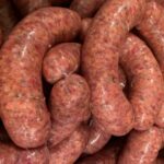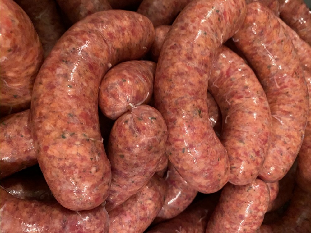 Our house made Gourmet Rosemary Garlic Lamb sausages are made in dinner natural hog size casings, approximately 4 per pound.