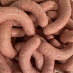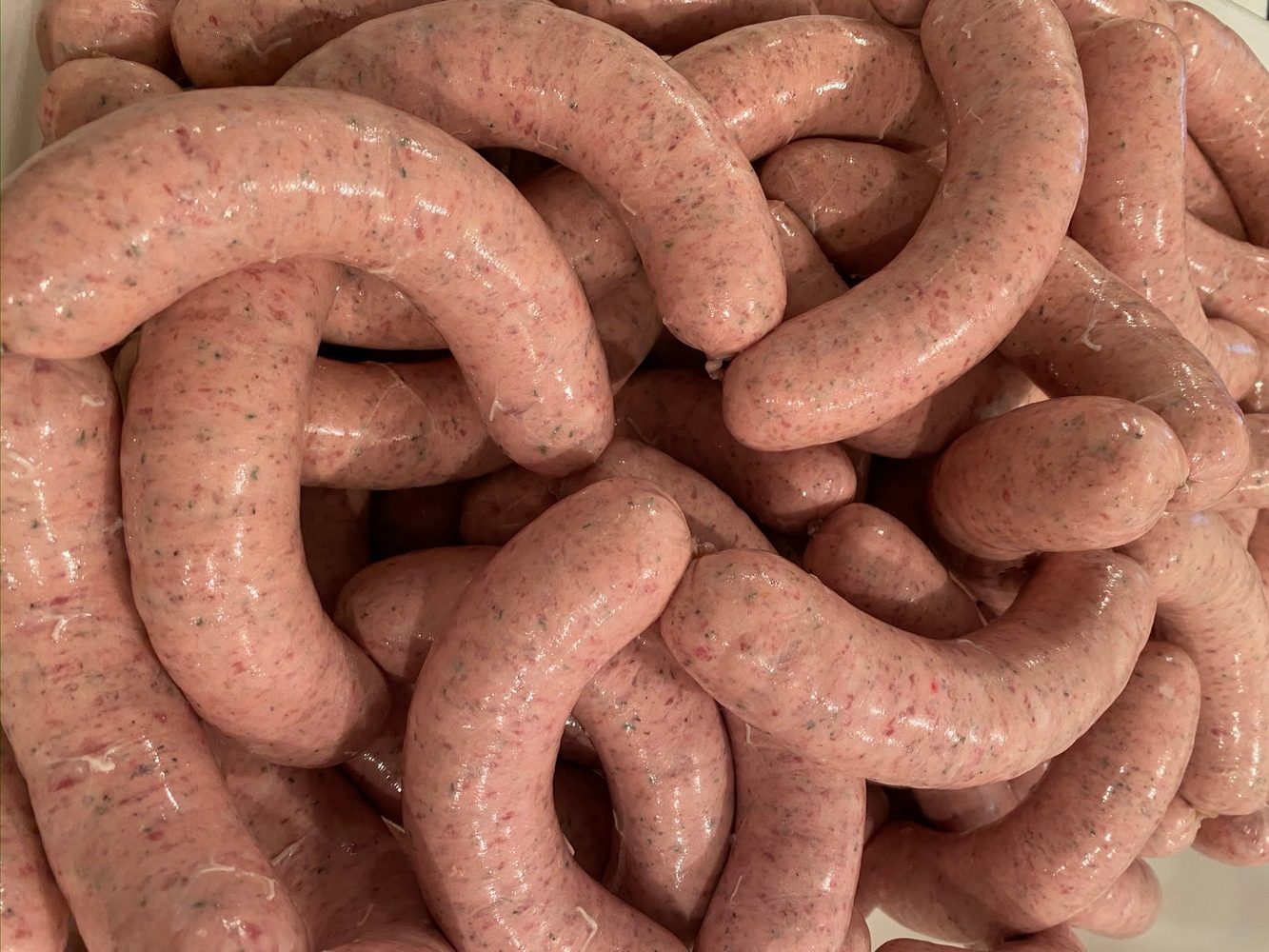 Our house made Peppered Bacon and Apple pork sausages are made in dinner size natural hog casings, approximately 4 per pound.