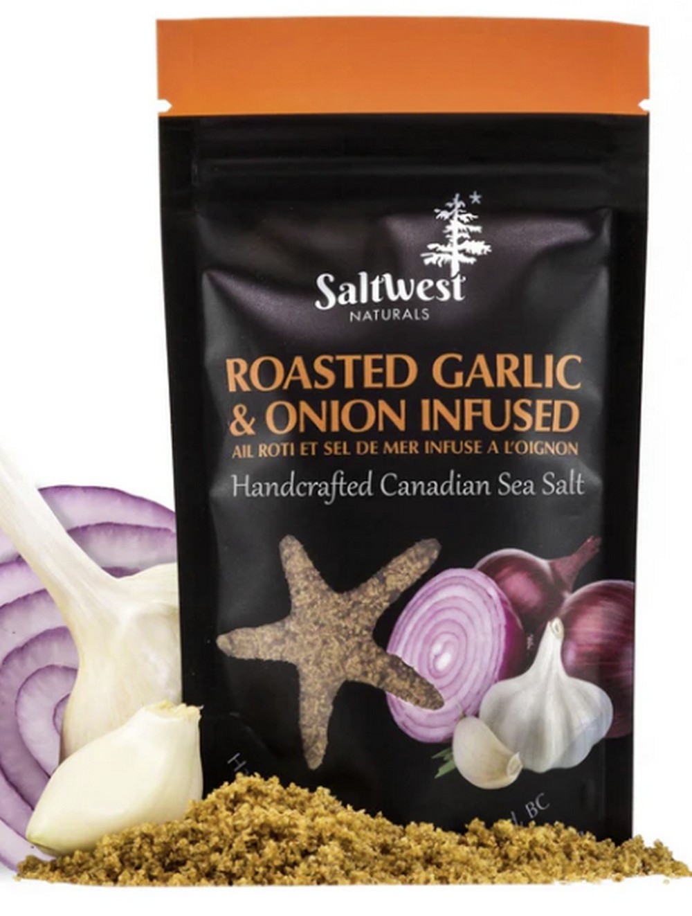 Our #1 infused Canadian sea salt flavour… Using high quality garlic cloves & diced onions we slowly roasted them with the sea salt to create rich sweet caramelized characteristic, perfect to season fish, meats, and veggies. Try a sprinkle on some pan-fried prawns, sauteed mushrooms or roasted potatoes. Rub it on steak, chicken or pork to enhance and finish with some fresh herbs.