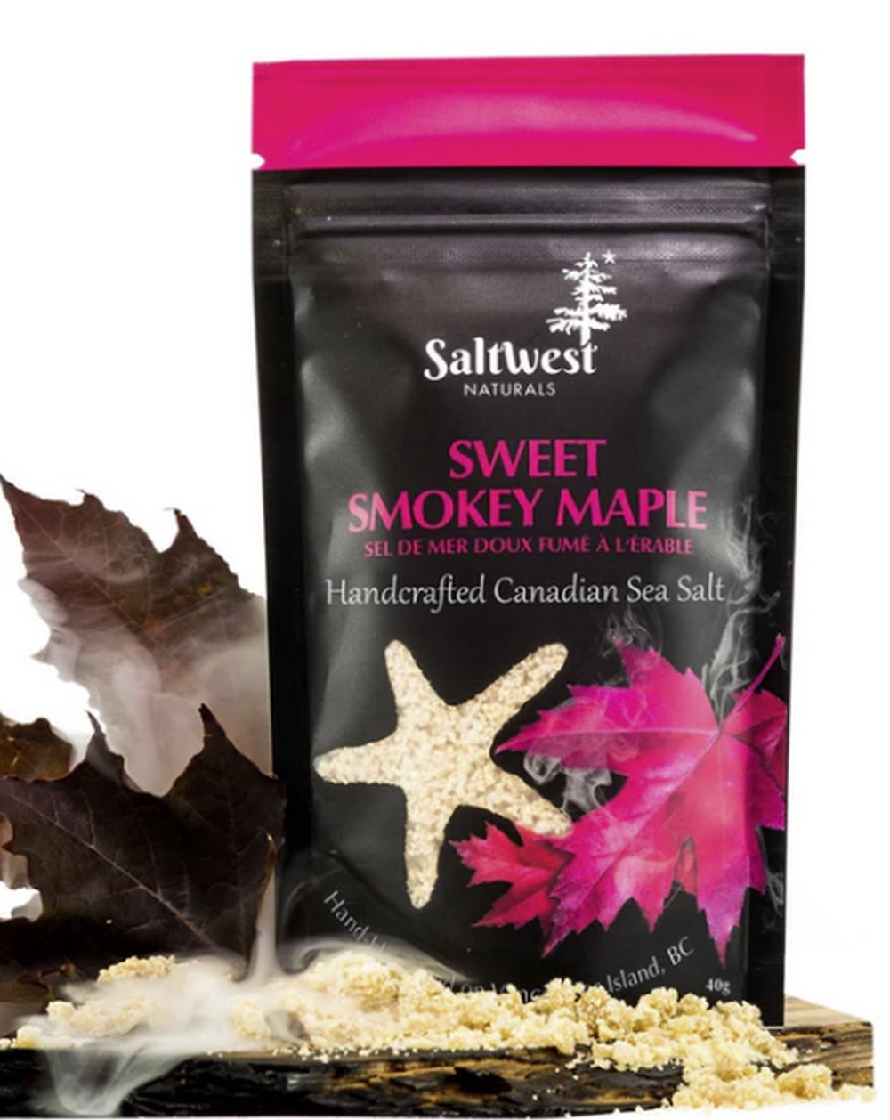 This Canadian coast to coast blend has a sweet, smokey salty dimension all-in-one. Using a cold smoke technique, small batches of our sea salt are infused with delicious Maplewood smoke. If you love Salmon, this is perfect to complement it. Use this as a rub on fish, chicken or pork. A wonderful seasoning for your candied pecans or roasted root veggies. Use it to make a tasty balsamic maple salad dressing. Add it to some sautéed mushrooms or onions for a great burger topper too!